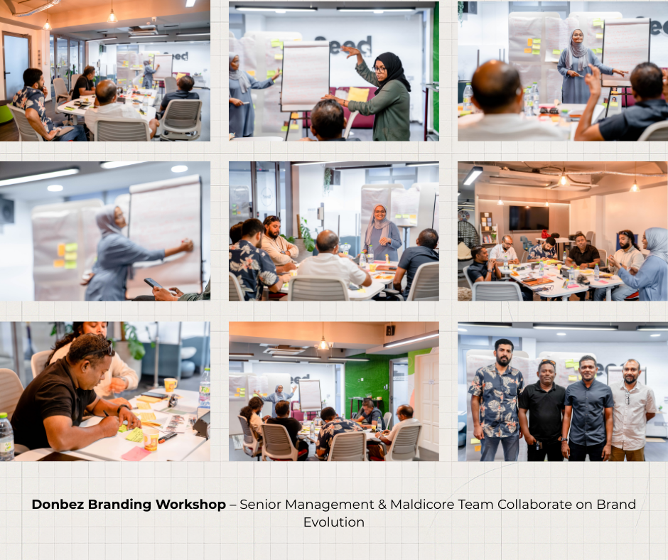 Photos from the Donbez branding workshop with senior leadership and Maldicore team collaborating.