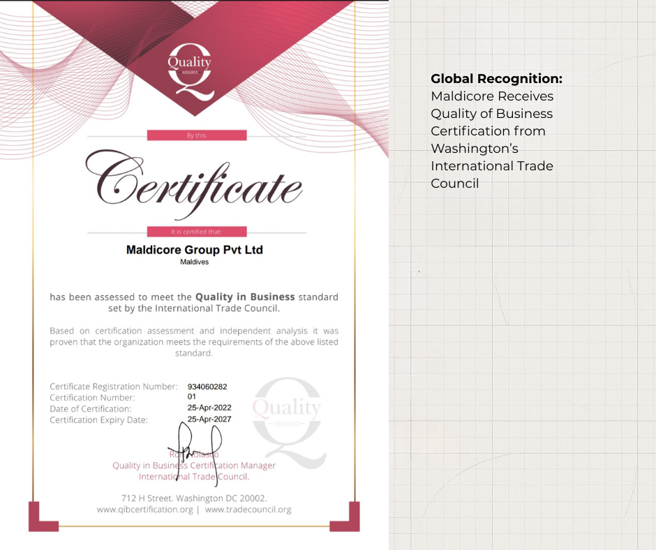 Maldicore’s Quality of Business Certificate from the International Trade Council, Washington.