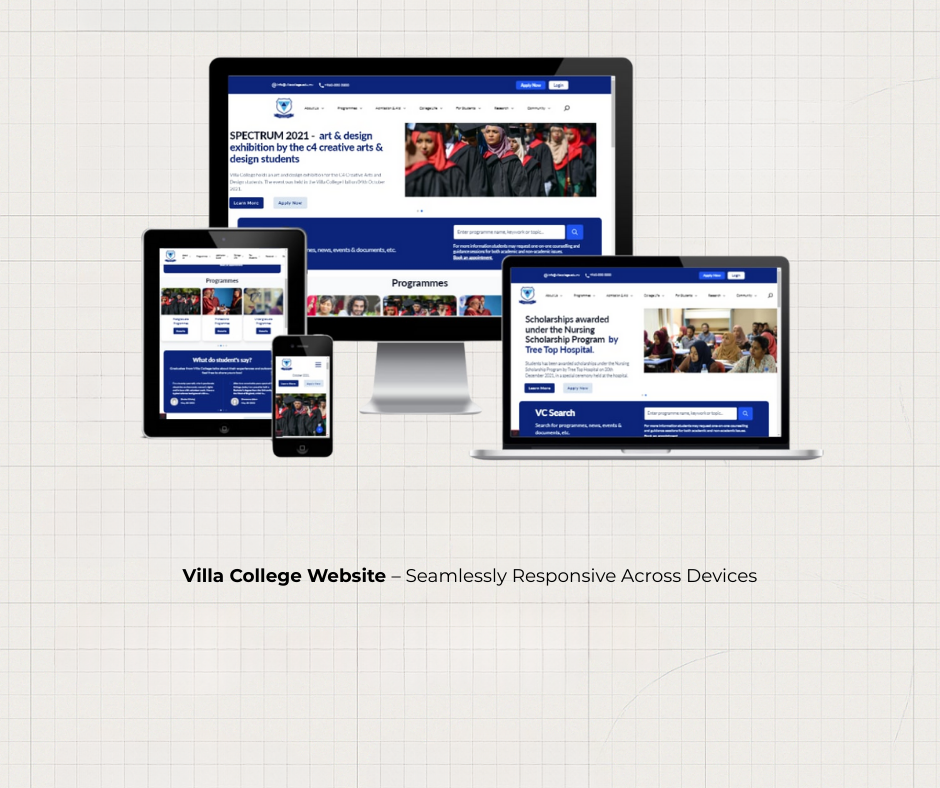 Mockup image of Villa College’s website shown across mobile, tablet, and laptop screens.